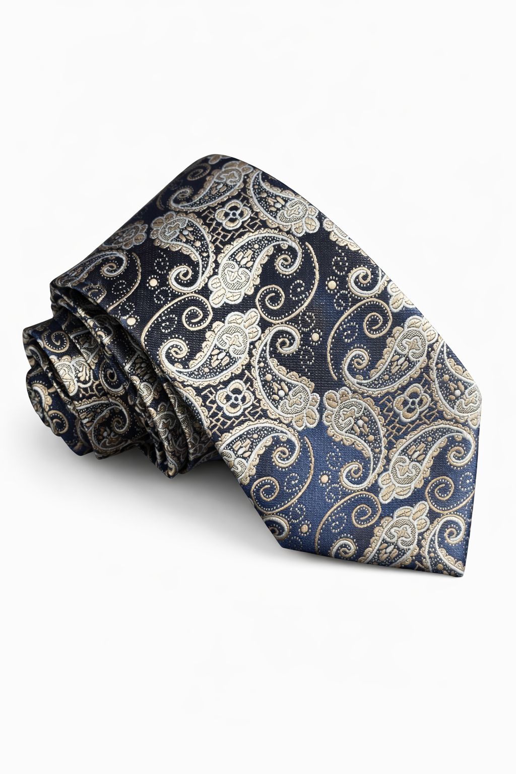 A gravata apresentada é uma peça elegante e sofisticada, com um design clássico de paisley em tons de dourado e branco sobre um fundo azul-marinho profundo. O padrão intricado de arabescos e flores estilizadas confere um aspecto luxuoso e versátil, adequado para ocasiões formais ou ambientes profissionais. A textura do tecido sugere qualidade e conforto, realçando o visual do usuário com um toque de requinte e estilo tradicional.
