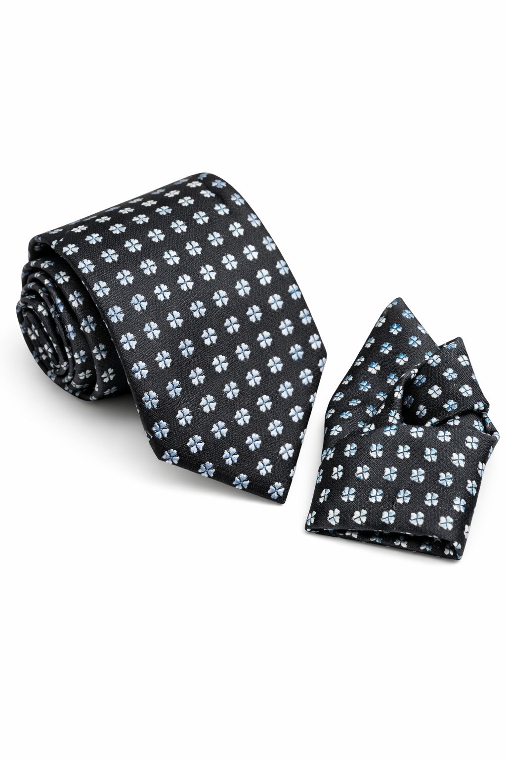 Gravata preta de seda 100% com padrão de pequenas flores brancas em formato de trevo de quatro folhas, distribuídas uniformemente na superfície. Design elegante e sofisticado, ideal para ocasiões formais. Feita de seda macia, proporciona conforto e brilho intenso. Perfeita para combinar com ternos e camisas sociais.