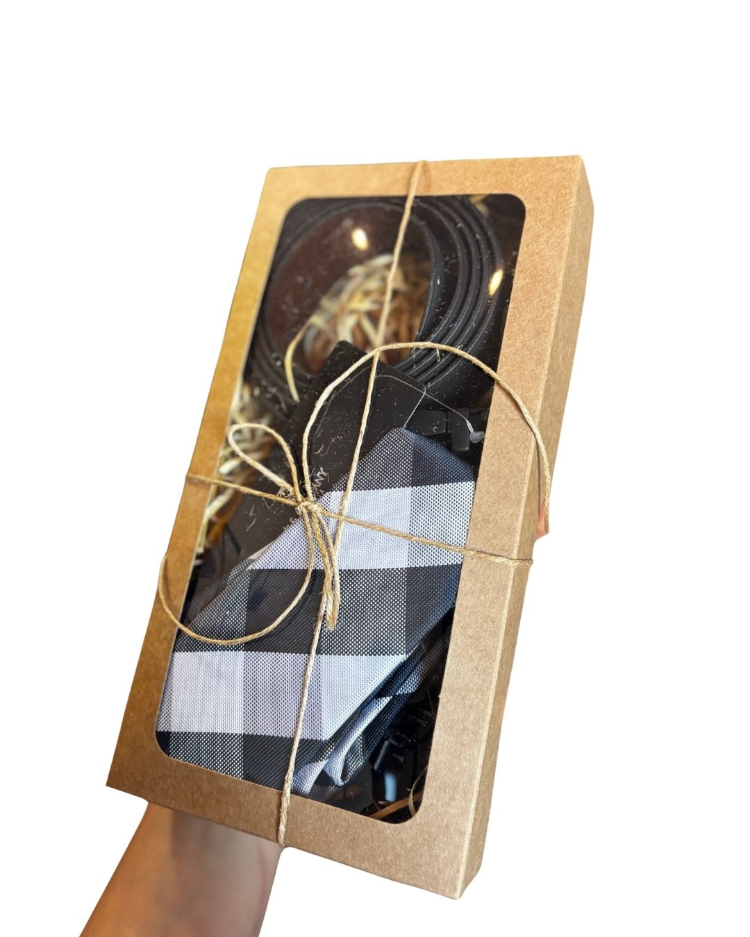 O cinto é feito em couro de alta qualidade, equipado com uma fivela giratória que facilita o ajuste, garantindo conforto e um caimento perfeito. O design da gravata slim realça o estilo contemporâneo, enquanto o cinto complementa qualquer traje, oferecendo resistência e durabilidade elevadas ao uso diário. Tudo isso embalado em uma caixa de kraft com tampa de viseira transparente, palha artesanal e laço de sisal, que adicionam um toque especial na embalagem, tornando o kit uma excelente opção de presente. Contém na embalagem uma gravata slim xadrez e um cinto de couro com fivela giratória. -