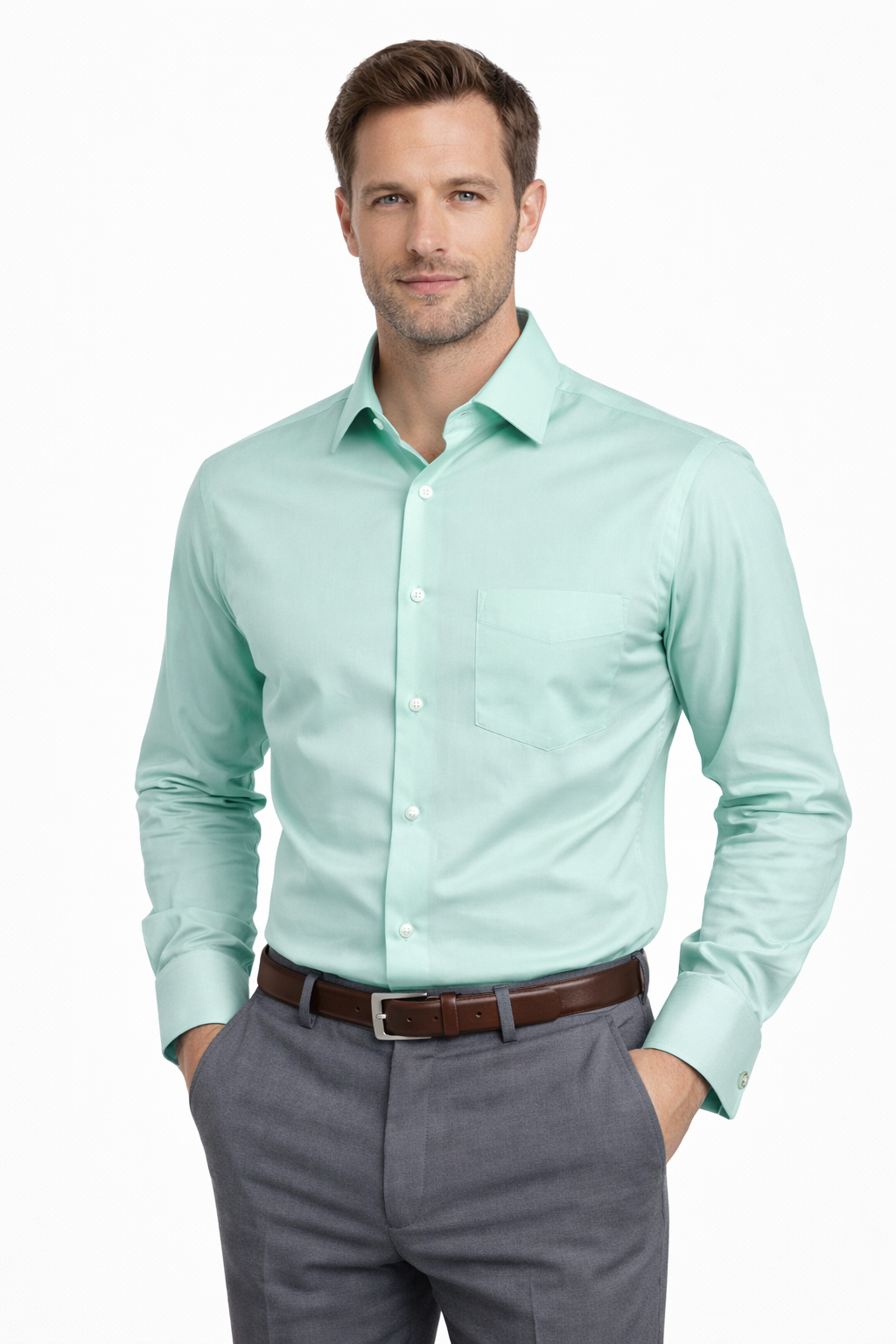 A Camisa Masculina social Diament de mangas longas, com corte Italian Classic, e colarinho francês - o mais eclético e fácil de combinar dos colarinhos. A cor verde clara carrega o estilo e discrição do homem contempoâneo.
